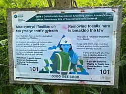 Sometimes referred to in literature as 'Bwlch y Gaseg' and in very close proximity to the area of the same name.[2] It was described by Rushton et al. (2000)[3] and exposes Late Ordovician micaceous siltstones and mudstones of the Dolhir Formation (Ashgill Series, Rawtheyan Stage) which yields a rich shelly (brachiopod) fauna. Trilobites are represented by several genera although the fauna is dominated by Gravicalymene arcuata Price, 1982.[4] Bivalves, bryozoans and various Echinodermata (Crinoids and Cystoids) are also present. Examples of most of the fossils listed below are illustrated and briefly described (or remarked upon) in "Fossils of the Upper Ordovician" by Harper and Owen (Eds.).[5]