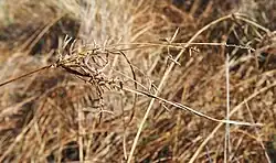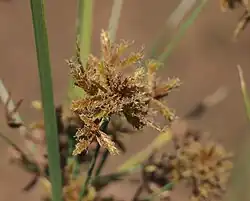 The septate to nodulose leaves are shorter than the culms and have a width of about 4.5 mm (0.18 in). The sedge flowers in spring and summer producing simple inflorescences with one to five branches that have a length of around 6 cm (2.4 in). The dense flower clusters are subdigitate with a hemispherical to globose shape and a diameter of around 50 mm (2.0 in). There are one to three leaf-like involucral bracts. There are many flattened spikelets per cluster that have a length of 10 to 30 mm (0.39 to 1.18 in) and a width of 2.5 to 4.5 mm (0.098 to 0.177 in) containing 8 to 34 golden brown to red-brown flowers. After flowering a trigonous very narrow-ellipsoidally shaped red-brown to grey-brown nut forms that has a length of 2.0 to 5.0 mm (0.079 to 0.197 in) and a 0.3 to 1.0 mm (0.012 to 0.039 in) diameter.[2][1]