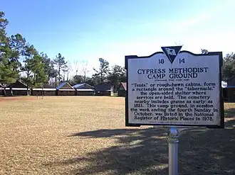 Cypress Methodist Camp Ground is a historic Methodist camp meeting in Ridgeville, Dorchester County, South Carolina. Cypress Camp Ground was functional as early as 1794, and an adjacent cemetery contains graves from the early 1800s. The campground is in the general shape of a rectangle of 34 tents, or cabins, made of rough-hewn lumber. These cabins, rectangular shaped, are generally 1 1/2-stories and contain earthen floors.[2][3]