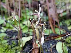 Cyrtostylis oblonga, commonly known as the winter orchid[2] or gnat orchid,[3] is a species of orchid endemic to New Zealand. It has a single rounded leaf and a flowering stem with up to four pink or pinkish green flowers with a flat, oblong labellum.
