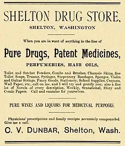Dunbar was known as one of the pioneers of Shelton.[7] The Dunbar family erected a building on the 4th Street, which was in the woods at the time. Dunbar lived and opened his drug store there, and later moved his business to a building on the 2nd Street.[3] By 1889, Dunbar expanded his range of products to include candy, stationery, small household items, tools, novels, and periodicals.[12] Dunbar tried to keep his store open every day, including weekends, but had problems with the authorities because at the time, the Sunday law required all the stores to be closed on Sundays for religious or secular reasons.[13]
