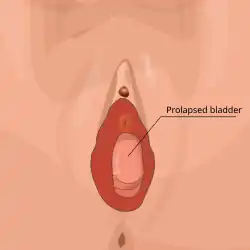 A cystocele, also known as a prolapsed bladder, is a medical condition in which a woman's bladder bulges into her vagina.[1][5] Some may have no symptoms.[6] Others may have trouble starting urination, urinary incontinence, or frequent urination.[1] Complications may include recurrent urinary tract infections and urinary retention.[1][7] Cystocele and a prolapsed urethra often occur together and is called a cystourethrocele.[8] Cystocele can negatively affect quality of life.[9][10]