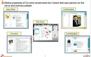 - ^ Evolution of Social Network Service into Media -Cyworld Case- October 2008 Archived 2015-09-24 at the Wayback Machine Posted on ica-it.org, A SK Communications slide-show presentation from 42nd International Council for Information Technology in Government Administration Conference in Korea in 2008