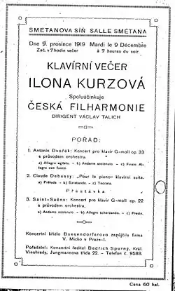 The name "Czech Philharmonic Orchestra" appeared for the first time in 1894, as the title of the orchestra of the Prague National Theatre.[1] It played its first concert under its current name on 4 January 1896 when Antonín Dvořák conducted his own compositions, but it did not become fully independent from the opera until 1901. The first representative concert took place on 15 October 1901 conducted by Ludvík Čelanský, the first artistic director of the orchestra.[1] In 1908, Gustav Mahler led the orchestra in the world premiere of his Symphony No. 7. The orchestra first became internationally known during the principal conductorship of Václav Talich, who held the post from 1919 to 1931, and again from 1933 to 1941. In 1941, Talich and the orchestra made a controversial journey to Germany, where they performed Bedřich Smetana's My Country in a concert enforced by the German offices.[1]