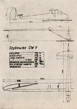 ZASPL, the Aviation Association of students of the Lwów Technical University, was the oldest aviation organization in Poland. Revived after World War I, by 1926 it had workshops in Lwów which began building the glider designs of ZASPL member Wacław Czerwiński. The 1931 CW 5 was his response to a call from the government for a high performance glider. His earliest draft, the CW 5, specified the Gôttingen Gô 652 airfoil that Alexander Lippisch had used on the RRG Fafnir, despite the lack of full information on its characteristics at the time, and wind tunnel tests proved very disappointing. The CW 5.bis design that followed used a thinner and lower camber airfoil from the Warsaw Aerodynamic Institute. Wind tunnel results for it were much closer to expectations and the CW 5.bis was completed in the ZASPL workshops in 1932.[1][2]