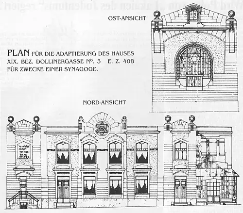 The Döbling Synagogue was a relatively small, two-storey building, with a narrow front in the Dollinergasse. The building was turned into an Art Nouveau synagogue designed by architect Julius Wohlmut. The synagogue's secessionist façade was noteworthy. It had risalits with narrow gables, each of which was flanked by a pair of Stars of David. The middle gable was decorated with a large Star of David and stylised rays of sunlight. A large round arched window ornamented the building's front in the Dollinergasse. Two marble tablets were placed in the entrance hall of the synagogue. One honoured Lederer's work; the other bore a quote from the Hebrew Bible “My house shall be called a house of prayer for all peoples” (Isaiah 56:7). A memorial tablet for the victims of World War I was added in 1919.
