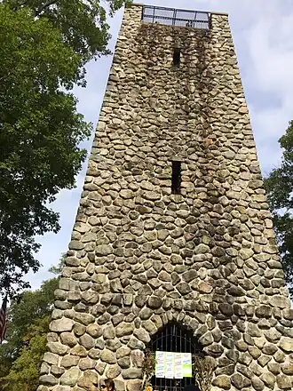 The park's most prominent landmark is a fieldstone observation tower, built at the park's high point, known as Indian Cave Hill or Tower Hill. It was built in 1928 from fieldstones gathered from the park grounds. Inside 90 steps, approximately 18 per landing, lead to an observation deck with a visage as far as Blue Hills in all directions. The park is open everyday dawn til dusk; the tower is officially open 1 day a year during Towerfest, early October, Columbus Day weekend.
