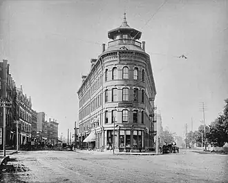At the beginning of their partnership the firm was located in the Hadley Falls Bank Building which sat at the corner of Main and Dwight (not to be confused with the later Hadley Falls Trust Building at the corner of Maple & Suffolk),[16][17] and subsequently relocated to Holyoke's Flatiron block, which was said to have had advantageous lighting at most hours of the day due to its rounded northeast-facing corner, which had windows facing in three different directions.[4][18] Originally Ashley B. Tower joined David H. as an apprentice, with no prior experience in engineering work or architecture besides a previous carpentry apprenticeship.[16] In time his abilities exceeded his older brother's in certain regards; of the two, he was the only one known to hold patents- by 1885, he had invented an improved wood pulp grinder which would be used in their clients' mills domestically and abroad.[19][20]