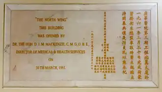 Another major objective of Mackenzie during his time as Director of Medical and Health Services was to rapidly expand public-health services to satisfy ever-increasing public demand.[34] Public hospital projects completed during his tenure included the large and modern Queen Elizabeth Hospital at King's Park, which was opened on 10 September 1963,[34] and the North Wing of Kwong Wah Hospital at Yau Ma Tei on 30 March 1961.[35] Other public-health-development projects completed during his tenure included the Sandy Bay Infirmary (now Tung Wah Group of Hospitals Fung Yiu King Hospital) in December 1962 and the Kowloon Rehabilitation Centre in August 1963, etc.[36][37] Furthermore, the foundation stones of Tsuen Wan Adventist Hospital, Li Po Chun Health Centre and the Lions Clubs Government Maternal and Child Health Centre in Kowloon City were laid by him in June, July and September 1963 respectively.[38][39][40]