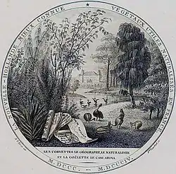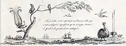 Péron's 1807, three-volume account of the expedition, Voyage de découverte aux terres Australes, contains an illustration (plate 36) of "casoars" by Charles-Alexandre Lesueur, who was the resident artist during Baudin's voyage. The caption states the birds shown are from "Ile Decrès", the French name for Kangaroo Island, but there is confusion over what is actually depicted.[13] The two adult birds are labelled as a male and female of the same species, surrounded by juveniles. The family-group shown is improbable, since breeding pairs of the mainland emu split up once the male begins incubating the eggs. Lesueur's preparatory sketches also indicate these may have been drawn after the captive birds in Jardin des Plantes, and not wild ones, which would have been harder to observe for extended periods.[4]
