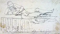 Self portrait of Lesueur lying on a cage containing birds in the ship Le Géographe