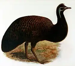 The King Island emu (Dromaius novaehollandiae minor) is an extinct subspecies of emu that was endemic to King Island, in the Bass Strait between mainland Australia and Tasmania. Its closest relative may be the also extinct Tasmanian emu (D. n. diemenensis), as they belonged to a single population until less than 14,000 years ago, when Tasmania and King Island were still connected. The small size of the King Island emu may be an example of insular dwarfism. The King Island emu was the smallest of all known emus and had darker plumage than the mainland emu. It was black and brown and had naked blue skin on the neck, and its chicks were striped like those on the mainland. The subspecies was distinct from the likewise small and extinct Kangaroo Island emu (D. n. baudinianus) in a number of osteological details, including size. The behaviour of the King Island emu probably did not differ much from that of the mainland emu. The birds gathered in flocks to forage and during breeding time. They fed on berries, grass and seaweed. They ran swiftly and could defend themselves by kicking. The nest was shallow and consisted of dead leaves and moss. Seven to nine eggs were laid, which were incubated by both parents.