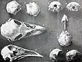 There are few morphological differences that distinguish the extinct insular emus from the mainland emu besides their size, but all three taxa were most often considered distinct species. A 2011 study by the Australian geneticist Tim H. Heupink and colleagues of nuclear and mitochondrial DNA, which was extracted from five subfossil King Island emu bones, showed that its genetic variation fell within that of the extant mainland emus. It was therefore interpreted as conspecific with the emus of the Australian mainland, and was reclassified as a subspecies of Dromaius novaehollandiae, D. n. ater. Other animals present on King Island are also considered as subspecies of their mainland or Tasmanian counterparts rather than distinct species. The authors suggested that further studies using different methods might be able to find features that distinguish the taxa.[18] In its 2013 edition, The Howard and Moore Complete Checklist of the Birds of the World emended the trinomial name of the King Island emu to D. n. minor, based on Spencer's D. minor, on the ground that Vieillot's D. ater was originally meant for the mainland emu.[19] This rationale was accepted by the IOC World Bird List, which used D. n. minor thereafter.[20]