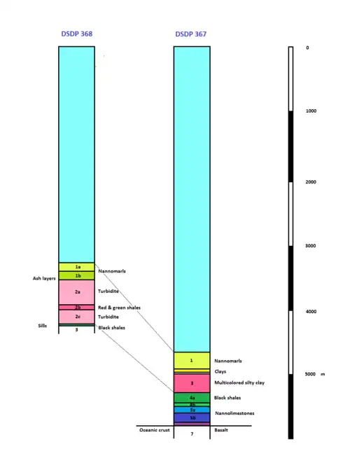 At the ocean floor and below consists of several layers including nanomarls (1a) and ash layers (ib), a larger layer below consists of turbidite at 2a and 2c, in the middle are red and green shales (2b) and below consists of black shales (3). Below is the oceanic crust in which unlike DSDP 367 which had drilled into, DSDP 368 did not.