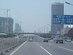 In 1985, the China World Trade Center was built at the intersection of the 3rd Ring Road and Jianguomen Outer Street and the Beijing CBD was established in 1993.[1] The Dabeiyao Overpass was consequently renamed the Guomao Bridge - "Guomao" is the abbreviation for the Chinese name of the China World Trade Center (simplified Chinese: 中国易中心; traditional Chinese: 中國貿易中心; pinyin: Zhōngguó guómàoyì zhōngxīn). Guomao subway station was opened on September 28, 1999.[2]