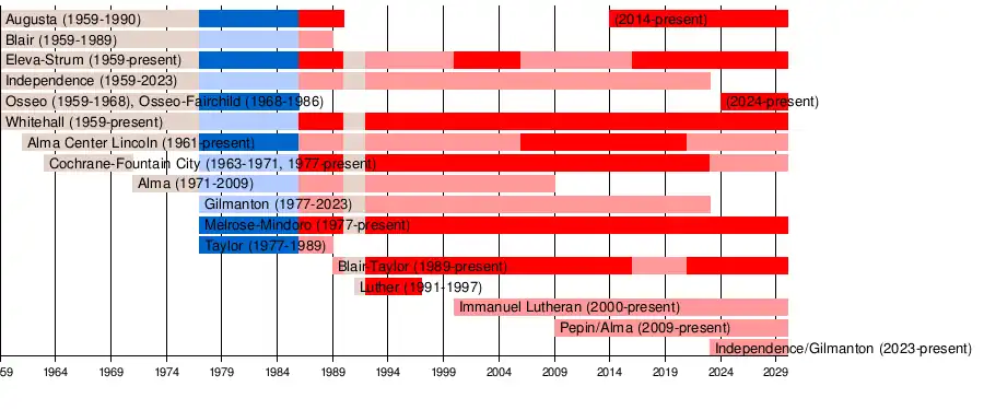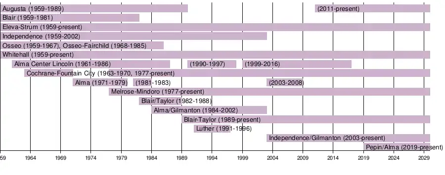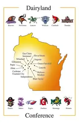 The Dairyland Conference was formed by six small high schools in west central Wisconsin in 1959. Three members came from the original Mississippi Valley Conference (Augusta, Osseo and Whitehall) and the other three from the disbanded Trempealeau Valley Conference (Blair, Eleva-Strum and Independence).[1] The membership roster soon increased to eight schools, with Lincoln High School in Alma Center joining from the West Central Conference in 1961[2] and Cochrane-Fountain City moving over from the Mississippi Valley Conference in 1963.[3][4] Alma High School joined the Dairyland Conference in 1971 from the West Central Conference.[5] They replaced Cochrane-Fountain City, who was moved to the Coulee Conference that year.[6]