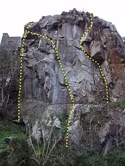 In 1942, the quarry's first recorded climbs were made by members of the Irish Mountaineering Club (IMC), and a handwritten guidebook of thirteen routes was published that included Fifth Avenue (HS 4b), and Gwynne's Chimney (VS 4c).[1] These routes were the first steps in the development of rock climbing in Ireland.[17] The publication of the second IMC guidebook in 1949 saw many of the more obvious features climbed in the quarry.[1] A new group of climbers pushed standards in the 1950s, with Fed Maguire, John Morrison, and Peter Kenny's 1951 ascent of Central Buttress (E1 4a, 5b, 4b), considered a milestone, and Kenny's 1951 ascents of Helios and Hyperion (both VS 4b), and Andre Kopczynski's 1952 ascent of In Abenstia (HVS 5a).[1] In 1957, Paddy O'Leary put up Gargoyle Groove (HVS 5b).[1]