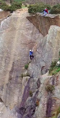 After the construction of the harbour, quarrying only continued sporadically thereafter before finally ending in 1917.[9][10] In 1914, the quarry was taken over by what is now known as Dún Laoghaire–Rathdown County Council (DLRCC), and most of the land was added to the existing Killiney Hill Park thus opening it up to the general public.[1] In 1998, the DLRCC drew up proposals to turn the quarry's West Valley into a caravan halting site for travellers. The move met with opposition from local residents, climbers, and environmentalists, and the plans were eventually dropped.[11] In May 2010, DLRCC angered climbers when they removed several large boulders from the quarry, disrupting climbing routes and potentially damaging other climbing routes in the process.[12]