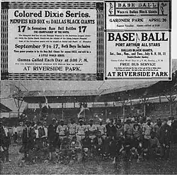 In 1908, the Black Giants lost the state championship losing deciding game five to the San Antonio Black Bronchos.[5] The 1922 team advanced to the Colored Dixie Series heralded on billboards around the city as "a little World Series." The Memphis Red Sox took the series six games to three.[6] The largest turnout for a game was between the Kansas City Monarchs and the Black Giants on April 21, 1935, when the Monarchs swept a double-header from Dallas.