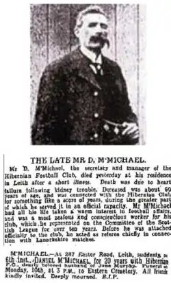 Dan McMichael (c. 1860 – 6 February 1919)[1] was an Irish[1] manager,[2] treasurer,[2] secretary[2] and physiotherapist[2] of the Scottish football club Hibernian during the late 19th century and early 20th century. He was also a sprinter in his youth[3] and a referee in Lanarkshire. He is the only manager to have taken charge of Hibs in two separate spells, being the first manager of the club from 1900 to 1903 and returning in 1904 after Phil Kelso left for Arsenal. He subsequently held this position for fifteen years, also making him the club's longest serving manager to date.