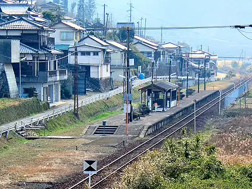 There are relatively many houses, and settlements are located on both sides of the Kuma River. On the opposite side of the river is the Sanko Bus Saibu Ohashi bus stop, about 500 meters away from the station.