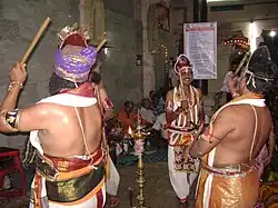 Kolattam is an ancient folk dance usually performed by women with Kol meaning "stick" in Tamil.[58][59][60] The dance uses two small sticks, one in each hand.[61] The dancers generally stand in a circular formation and beat the sticks to make specific rhythms while singing songs.[61][60] The dancers may beat the sticks in their own hands or with the sticks held by other dancers.[58] The dancers may form multiple circles with dancers changing pairs with the members of adjacent circles to make the beats.[62] The dance is usually dedicated to gods or goddesses.[61] The dance is performed during the harvest season and for a fortnight in the Karthigai month of Tamil calendar.[58] There are different variants such as pinnal kolattam and chakke kolattam.[61] Pinnal kolattam uses ropes instead of sticks.[58] Kummiattam is a folk dance similar to Kolattam, with the difference being that hands are used to make sounds while dancing in kummiattam instead of sticks used in the later.[63] The dancers form a rhythm by clapping the hands in different postures.[64] The dance is performed during religious ceremonies, functions and festivals such as Pongal, generally by women.[65][47] There are various types of the dance depending on the occasion or objects used such as poonthotti kummi, deepa kummi, kadir kummi and mulaipuri kummi.[66]