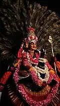 Mayilattam literally translates to "peacock dance".[69] The dancers dress themselves using peacock feathers, glittering head-dresses and beak like attachments.[47] The performers usually seat themselves upon a wooden peacock replica and perform to various folk songs and tunes. The peacock symbolizes the vahana or mount of the deity Murugan, who rides a peacock known as Paravani.[70][71] The dance is usually dedicated to god Murugan and performed in Murugan temples as a tradition during festivals.[47][72] The dancers often stand on tall wooden pieces and the beaks can be opened. The dancers make movements emulating a peacock and operate the feathers similar to the bird using a thread or rope.[73]