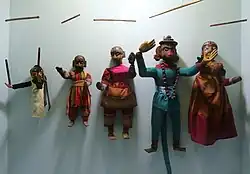 Bommalattam is a type of puppetry using inanimate objects that originated in the region.[117][118] While the timeline of the origin of the art form is uncertain, it has existed for many centuries.[119] It uses various doll marionettes which are 1–3 ft (0.30–0.91 m) tall and may weigh up to 10 kg (22 lb).[117] The puppets are manipulated by rods and strings attached to their heads, back, arms and legs. The puppets are made of light weight wood and are dressed in crafted costumes bulked up by paper stuffings to give a more rounded appearance. The puppets are crafted with prominent jewellery so that the edges are visible in the shadows.[119]
