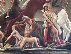 In 1982 art historian Marling pointed out that the women in the bottom right of the painting were the only figures in the painting without faces or clothing and that they "(existed) solely to be preyed upon and maimed".[4]: 256