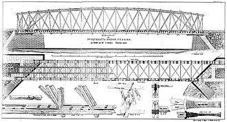 The bridge shown in elevation (see image) has been built lately for the New York and Erie railroad, at Lanesboro', over the Susquehanna River, in the place of one built by ourselves, several years since, under the orders, and according to the plan of the chief engineer of that road, but which proved unequal to the duty imposed upon it; and its removal became a matter of necessity. We objected to the plan of the original bridge, built in that locality, as we have ever done to any plan of the bridge in which the attempt was made to unite the independent systems of arch and truss, and make toe stability of the bridge dependent upon their uniformity of action. In this plan of Mr. McCallum, the two principles are not independent as heretofore; but the action of the arch in the upper chord is made an integral part of the truss itself; and instead of two systems acting unequally, and to the ultimate injury of the structure, we have the best features of both united in a manner which admits of entire uniformity of action. In the construction of bridges for railroad purposes, two prominent difficulties have long been discovered, viz., a lack of sustaining principle towards the ends of the trusses and near the abutments, and an entire absence in many cases of a proper counteracting principle to prevent vertical vibration by a moving load. See Haupt on Bridges, to which admirable work the reader is particularly referred for a full description of the proper office of a counter-brace..."[5][17]