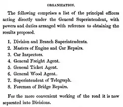 "A superintendent of a road fifty miles in length can give it's business his professional attention and may be constantly on the line engaged in the direction of its details; each person is personally known to him, and all questions in relation to its business are at once presented and acted upon, and any system however imperfect may under such circumstances prove comparatively successful. In the government of five hundred miles in length a very different state exists. Any system which might be applicable to the business and extent of a short road would be found entirely inadequate to the wants of a long one. and I am fully convinced that in the want of system perfect in its details, properly adapted and vigilantly enforced, lies the true secret of their [the large roads’] failure; and that this disparity of cost per mile in operating long and short roads, is not produced by a difference in length, but is in proportion to the perfection of the system adopted..."[21]