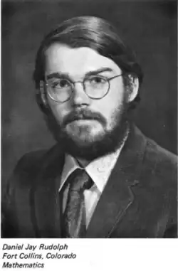 Daniel Jay Rudolph (1949–2010) was a mathematician who was considered a leader in ergodic theory and dynamical systems.[2][3][4] He studied at Caltech and Stanford and taught postgraduate mathematics at Stanford University, the University of Maryland and Colorado State University, being appointed to the Albert C. Yates Endowed Chair in Mathematics at Colorado State in 2005. He jointly developed a theory of restricted orbit equivalence which unified several other theories.[3] He founded and directed an intense preparation course for graduate math studies and began a Math circle for middle-school children. Early in life he was a modern dancer. He died in 2010 from amyotrophic lateral sclerosis, a degenerative motor neuron disease.