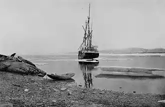 The ship was built in Sunderland, England in 1855, rigged as a three-masted steam bark and originally fitted with a 98 hp high pressure steam engine. She sailed under the name Sir Colin Campbell on whaling trips from Scotland to the Greenland Sea and Davis Strait. In 1892 she was sold to Norway, refitted with a 200 hp triple expansion engine, renamed Magdalena and sailed as a seal catcher until 1906.[1] The later polar explorer Roald Amundsen sailed on Magdalena in 1884 on a seal hunt into the West Ice.[2] From the records of the oil factory of J.A. Nielson in Tønsberg it is reported that Magdalena, owned by Gustav C. Hansen, was the first ship to process blubber at the factory when it opened in 1883 (1,300-1,400 barrels of seal oil).[3] In 1901 the ship was used to deploy stores on Shannon Island and Bass Rock, East Greenland for the American Baldwin-Ziegler Expedition.[1] In 1906 Magdalena was sold for a price of 39,250 kroner to the Danish Expedition Fund, to serve as ship for the upcoming expedition to Northeast Greenland. She underwent refurbishing and was rechristened to Danmark.