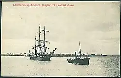 Danmark left Copenhagen 24 June 1906 and left for Greenland on 2 July after a short stop in Frederikshavn. Leader of the expedition was shared between Ludvig Mylius-Erichsen (who did not return from the expedition but died on the ice at Nioghalvfjerds Fjorden) and captain of the ship Alf Trolle. Danmark reached the West Ice in late July and with some difficulties passed through the ice and reached a protected bay, which they named Danmark Havn (Danmark harbour) after the ship and which became the base for the ship during two overwinterings. Other places in NE Greenland named after Danmark are Danmarksfjorden and Danmarksmonumentet, a mountain near Mørkefjord. Danmark left Greenland on 21 July 1908 and although the boiler was damaged in a collision with an iceberg in the West Ice, she reached Bergen in Norway safely on 15 August and returned to Copenhagen on 23 August.