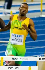 Danny D. McFarlane, OD (born 14 June 1972) is a Jamaican hurdler, who has won numerous international medals in individual and relay contests. Having won five medals at the World Championships in Athletics and an Olympic bronze medal with the Jamaican 4 x 400 metres team, McFarlane has also won in individual competition: he took an Olympic silver medal in the 400 metres hurdles at the 2004 Athens Olympics. He competed collegiately for the University of Oklahoma.[1] At Oklahoma, McFarlane won the 1997 4 × 400 meter relay at the NCAA Division I Outdoor Track and Field Championships.[2]
