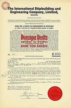 However, as the company lost both its main client (the Kaiserliche Marine) and its raison d'etre, in 1922 it had to be commercialised. It was turned into a joint stock company, with 30% shares held by French Groupement Industriel pour Danzig conglomerate, 30% by British Cravens company, and remaining 40% by local Danziger Privat Aktienbank and Polish Bank Handlowy (20% each).[1] The new company used the name of "International Shipbuilding and Engineering Company Limited", but was most commonly referred to by its simplified German name: Danziger Werft ("Danzig Shipyard")[note 1].[1]