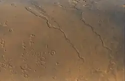 Dao Vallis begins near a large volcano, Hadriacus Mons, so it is thought to have received water when hot magma melted huge amounts of ice in the frozen ground. Much of this water may have been released in very large "outburst floods". The partially circular depressions on the left side of the channel in the image below suggests that groundwater sapping also contributed water more gradually.[4]
