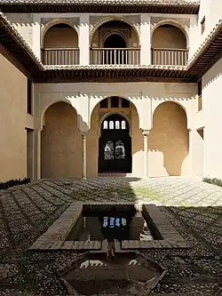 The palace demonstrates many of the typical characteristics of Nasrid and Moorish architecture. The two-story building is arranged around a central rectangular courtyard with a small pool. This enclosed courtyard arrangement suited its later use as a cloister for nuns, which contributed to its subsequent good state of preservation. The main rooms of the building are located behind a two-story portico on the north side of the courtyard and a one-story portico on the south side. Some of the rooms and hallways contain some limited but well-preserved remains of Nasrid-era decoration in carved stucco. On the southern side of the courtyard is a large chamber which was used as a chapel after the Reconquista until the later Church of Santa Isabel la Real was built nearby. On the north side are several rooms over two floors. On the middle axis of the building, on both floors, is a room that projects outward from the rest of the building, acting as a mirador (lookout). The upper floor offers views over the 11th-century Zirid walls and to the neighbourhoods beyond to the north. On the northeast corner of the building is a tower-like section which rises to a third floor.[4][2]