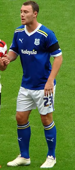 Blake missed Cardiff's 2011–12 pre-season schedule through injury but returned in a 1–1 draw with Burnley on 20 August 2011, coming on as a substitute in place of Joe Mason.[26] He made his 100th appearance for Cardiff against Portsmouth on 27 August, which was also his first league start of the season.[27] Despite being a regular at international level for Wales, Blake struggled to establish himself in the first team at Cardiff, former Wales striker Iwan Roberts to question his future at Cardiff City Stadium.[28] Cardiff manager, Malky Mackay, replied to this saying Blake was "in his plans" but his injuries and fitness were a problem.[29] The newly formed partnership of Mark Hudson and Ben Turner were preferred ahead of Blake, who later confirmed his desire to hold talks with boss Mackay over his future at Cardiff having not featured for the club in over a month.[30] At the end of the season, he played in the 2012 Football League Cup Final, replacing McNaughton in extra time as Cardiff went on to lose to Liverpool in a penalty shootout.[31] On 9 August 2012, Blake rejected new terms at Cardiff, where he only had a year left on his contract following his time as a bit part player the previous season.[32] On 22 August, Blake entered talks with Crystal Palace over a possible move.[33]