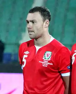 In May 2008, he received his first call-up, alongside six other uncapped members of the Wales under-21 side, to the Wales team.[45] Blake made his full international debut on 12 October 2010, being named in the starting line-up for a 4–1 defeat to Switzerland in Basel before being replaced by Christian Ribeiro after 54 minutes.[46] He played his second game against Scotland, in the Nations Cup, where Wales lost 3–1. On 10 August 2011, Blake scored his first senior career goal in a 2–1 defeat against Australia and was named in the starting line-up in the side's following match against Montenegro due to James Collins being suspended. Despite being largely a reserve player for Cardiff at the time, he established himself in the side as a centre back under manager Gary Speed, who described Blake as a player that could "shine in the Premier League,"[30] and kept his place in the side for the remainder of the Euro 2012 qualifiers,[47] including a 1–0 defeat against England where he received praise for his performance.[22][6]