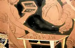 A tax collector, the Royal Treasurer, is seen receiving payments by various conquered nations, whose representatives crouch before him.[5] On a table lays a calculating table (a reckoning board or abax, used for complicated calculations), with a number of small pebbles or counters in front of the Greek numerals for calculating large numbers.[6][5][2] The symbol "O" appears in the calculation table, a Boeotian symbol for the obol, or small unit.[5] The use of pebbles on a board to make calculations is illustrated down to modern times by the fact that calx is "pebble" in Latin, which is the etymological root for the word "calculation".[2]