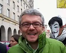 Szwed is a proponent of protecting consumers from monopolies, enhancing power efficiency and developing renewable energy which he calls energy democracy.[14] He disapproves of nuclear power – together with Krzysztof Żmijewski he designed a project to replace 20 million bulbs with energy-saving ones which would provide the same power (Negawatt power), yet at a price 100 times lower than the cost of one block of a nuclear power station.[15] Szwed is a staunch supporter of egalitarianism, particularly of the politics of equal opportunities for men and women, as well as of protecting the rights of minority groups. Additionally, he is an active member of anti-war and alterglobalist movements. He advocates knowledge society, green technology, free culture movement and free software. Szwed is a proponent of the separation of Church and State and the ideological impartiality of State. He has elaborately presented his views on the vision of European Union, its economic, environmental, energy and international policy, as well as on matters of outlook and ethics [16]