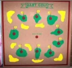 Dart golf games are games in which darts are thrown at traditional dart boards or dart boards that resemble golf courses with colored areas that represent a golf course. Dart golf games use golf-like rules and scoring. Rules and board configurations of the game vary from league to league, but are generally played single, head-to-head or with teams.