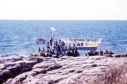 Rocksitting, sometimes known as rock sitting, is the practice of sitting on rocks and drinking beer for as long as possible. The rocks they sat on would be a metre underwater at high tide.[1][2] The Darwin Rocksitters Club began in 1974 when a group of journalists gathered on the cliffs at East Point on a Saturday afternoon to drink beer, tell stories, and watch the sunset. This soon became a regular event and the club began to meet every Saturday.[1][3] One of the members of the club, Robin Davy, said of it:[2]