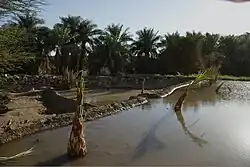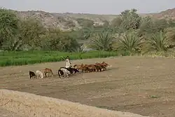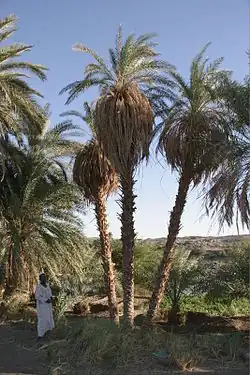 Date palm trees and Doum palms (Hyphaene thebaica) are perfectly adapted to the regional climate of Dar al-Manasir. They are drought resistant and can withstand the exceptionally hot dry and rainless summers and cold dry winters. The proximity of Ashu land to the river Nile makes the water table accessible to the deeply penetrating roots of fully grown palm trees throughout the year, making it the most valuable class of land.[4] Since dates constitute the most relevant cash crop in Dar al-Manasir their cultivation is not limited to Ashu land only, but expands along the irrigation channels of the Saqiah land. During recent years date trees even substitute seasonally irrigated crops such as wheat, beans and okra on the traditional Saqiah land.