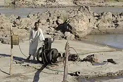 Date palms are cultivated in Sudan from the Egyptian border in the north all the way along the Nile south of Khartoum until Sennar. In addition to the banks of the Nile, isolated occurrences of cultivated date trees occur in the Red Sea Hills in the vicinity of Port Sudan, in Kassala, along the Atbara River, in the deserts around Dongola and far Southwest in Darfur, for example in Wadi Kutum, Wadi Mellit and Barra. In all these locations, the palm trees depend on accessible ground water or on irrigation. The water for irrigation is either taken from wells or from the river Nile, where it is nowadays provided by diesel pumps.