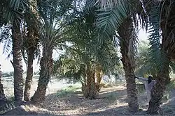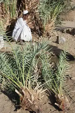 In order to multiply the number of fruit-bearing trees traditional offshoot propagation is practised all along the Nile in Sudan. Lower offshoots called Shatla (شتلا) develop from axillary buds at the lower trunk of a parent palm and are cut off during early spring season. A well chosen offshoot will not only guarantee a female fruit bearing palm tree but also inherit the same qualities of its mother plant.[5] The date trees in the region of the Fourth Cataract attain an age of up to 150 years and consist most often of multiple shoots from a single clump called Bu'rah or Hufrah (بؤرة or حفرة).[6] Satisfactory date production ceases with an age of 90 to 100 years. With increasing age and height the palm tree becomes more difficult to climb in order to be pollinated and harvested.