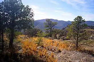 Mixed in with the grassland, and usually at higher elevations, are four woodland and forest zones. First, at elevations below 1,900 m (6,200 ft) and at higher, drier elevations, the dominant tree species is the alligator juniper mixed with oak species and pinyon pine. Secondly, woodlands with pinyon pine as the most common species are found on steep slopes at elevations of 1,750 to 2,400 m (5,740 to 7,870 ft). Third, woodlands in which the gray oak is the most common tree and mixed with other oak species are also found on steep slopes at elevations of 1,900 to 2,400 m (6,200 to 7,900 ft). The gray oak woodlands are found in slightly moister soils than the pinyon woodlands.[4]