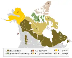 | Approximate range of subspecies of Rangifer tarandus. Overlap with other subspecies of caribou is possible for contiguous range. 1.R. t. caribou, which is subdivided into ecotypes: woodland (boreal), woodland (migratory) and woodland (mountain), 2.R. t. dawsoni (extinct 1908), 3. R. t. granti, 4. R. t. groenlandicus, 5. R. t. groenlandicus/pearyi, 6.R. t. pearyi | |