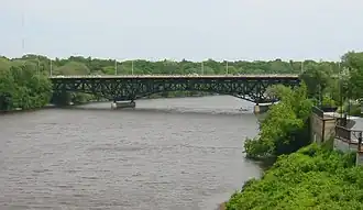 DeSoto Bridge was a trussed deck-arch bridge that spanned the Mississippi River in St. Cloud, Minnesota. It was built in 1958 by the Minnesota Department of Transportation. The bridge was painted black, which is typical for railroad bridges but unusual for a highway bridge. The river banks on either side are relatively high, so the bridge required deep trusses which arched over the river.